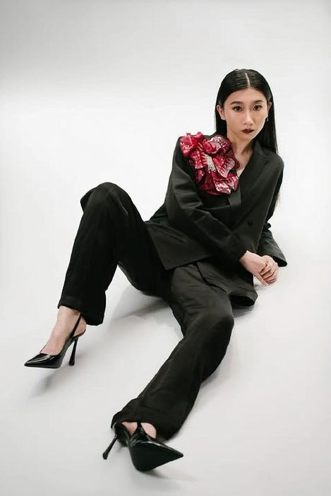 The first piece that I was inspired me was the black women's suit. The look is elevated with an embellished floral accent—a balance of confidence and femininity. The same floral motif reappears in a sleek, form-fitting dress, reinforcing the power of versatility in fashion. These designs from Indian label Twinkle Hanspal are not just about aesthetics; they represent the adaptability of modern women who refuse to be confined to a single definition of power dressing.